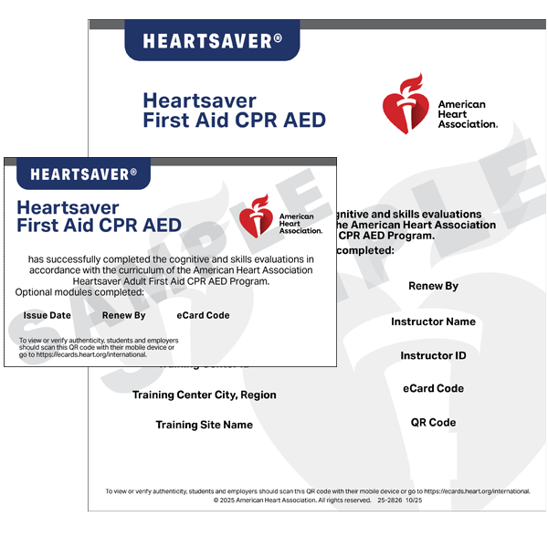 The Heartsaver® First Aid CPR AED eCard (International) is the digital version of the Heartsaver First Aid CPR AED printed course completion card. It is a valid, more secure, and preferred alternative to the printed card. eCards are issued by AHA Training Center Coordinators and Instructors to students who successfully complete all requirements of an AHA course. Students receive an email inviting them to claim their eCard online. Once claimed by the student, employers then can validate course training at www.heart.org/ cpr/mycards. This course completion card should be issued to students who successfully complete all requirements of the Heartsaver First Aid CPR AED course outside the U.S. that has been updated with new science from the American Heart Association 2025 Guidelines for Cardiopulmonary Resuscitation and Emergency Cardiovascular Care. This product replaces the IVE First Aid CPR AED eCard (20-2826).