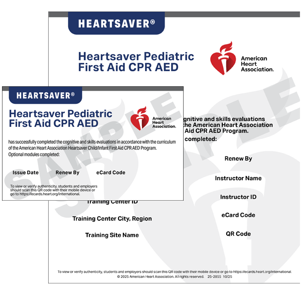 The Heartsaver® Pediatric First Aid CPR AED eCard (International) is the digital version of the Heartsaver Pediatric First Aid CPR AED printed course completion card. It is a valid, more secure, and preferred alternative to the printed card. eCards are issued by AHA Training Center Coordinators and Instructors to students who successfully complete all requirements of an AHA course. Students receive an email inviting them to claim their eCard online. Once claimed by the student, employers then can validate course training at www.heart.org/cpr/mycards. This course completion card should be issued to students who successfully complete all requirements of the Heartsaver Pediatric First Aid CPR AED course outside the U.S. This product has been updated to reflect the latest science and education from the American Heart Association 2025 Guidelines for Cardiopulmonary Resuscitation and Emergency Cardiovascular Care. This product replaces the IVE Pediatric First Aid CPR AED eCard (20-2855).